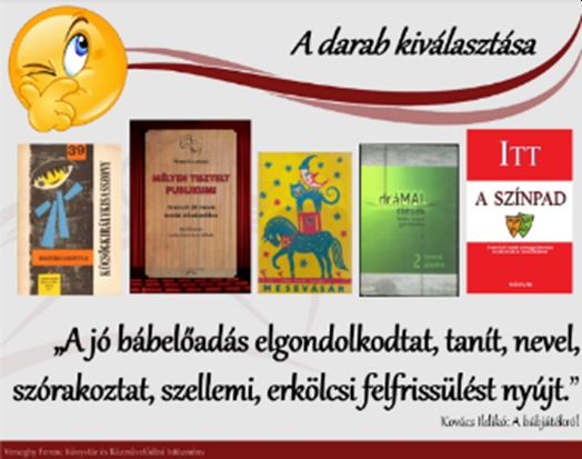 A darab kiválasztása: Szintén az adott évi munkatervben rögzített, hogy mely időpontokban, milyen alkalmakra tartunk nyilvános, családi bábelőadásokat, illetve készítünk újakat. A darab kiválasztásakor felvetődő kérdések: Milyen tartalmat közvetít a történet, mi a mese tanulsága? Mi az előadás célja? Milyen hatást kíván elérni? Kik a mese szereplői? Hányan játsszák? Kiosztható, előadható? Milyen korosztálynak szól? Mi a választott bábtechnika, ill. megjelenési forma, a képi és akusztikus világa? Hol található alkalmas mese, történet? Mindig az 5-9 éves korosztály érettségi szintjének megfelelő népmeséket, meséket, történeteket választunk mesekönyvekből, illetve nyomtatott formában megjelent szövegkönyvekből.