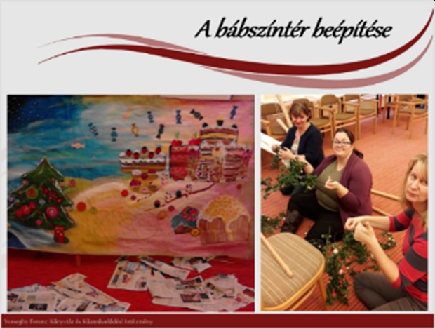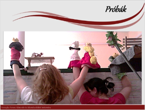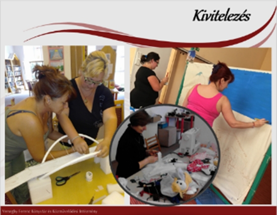 Kivitelezés: A megtervezett színpadtechnikai eszközök: díszletek, bábok, jelmezek, kellékek elkészítésével, beszerzésével folytatódik a folyamat. A díszleteket, a bábok egy részét és a kellékeket magunk készítjük. Többfajta bábot használunk: alulról mozgatott kesztyű-, bot-, pálcás, sík-, tárgybábokat és felülről mozgatott vezetőpálcás marionett bábokat. A kesztyű- és a marionett bábokat a készítőtől vásároljuk. A bot-, pálcás, síkbábokat mi készítjük.